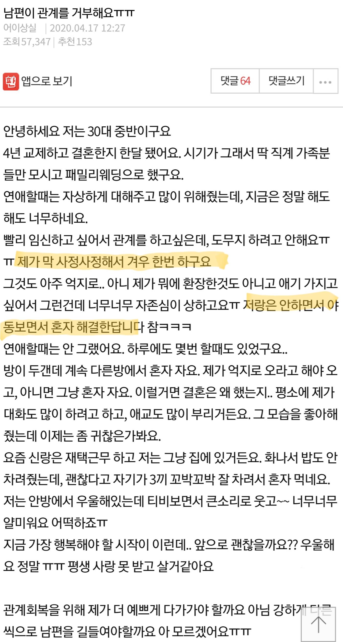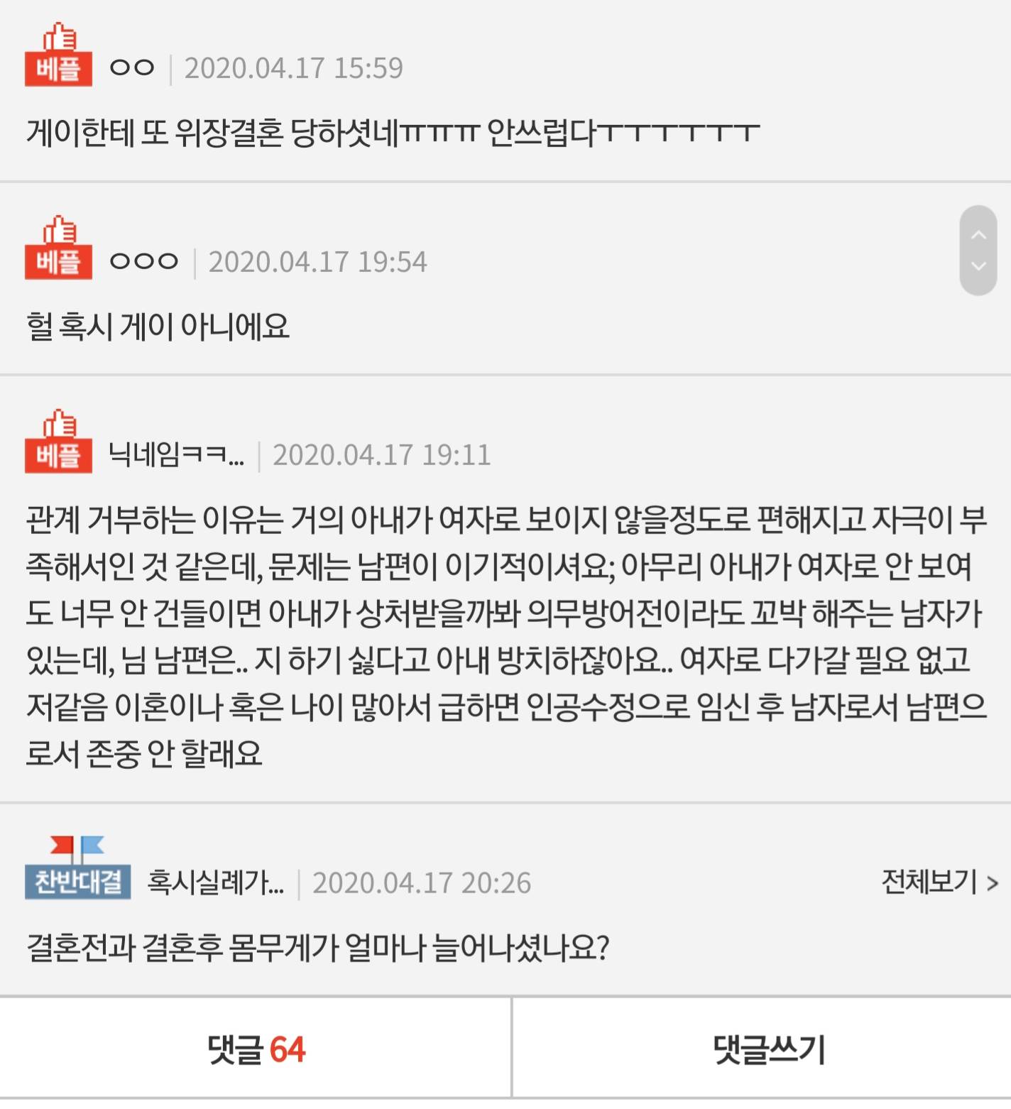 찬반좌도 찬반좌인데 베댓들은 병신인가 결혼 전에는 잘만 했다고 써있는데 ㅋㅋㅋ