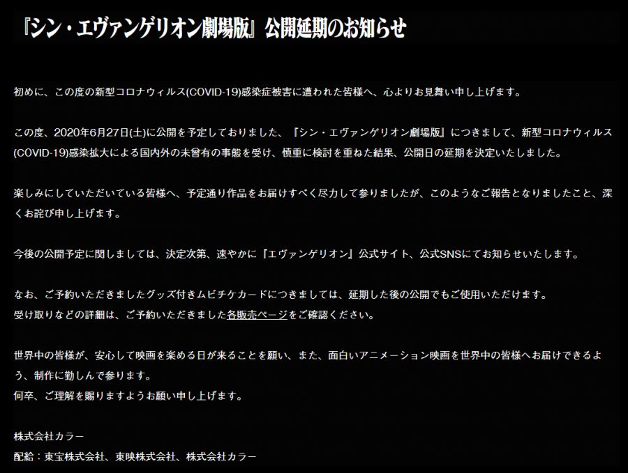 이번에, 2020년 6월 27일(토)에 개봉할 예정이었던, 「신·에반게리온 극장판」에 대해서, 개봉일의 연기를 결정했습니다.