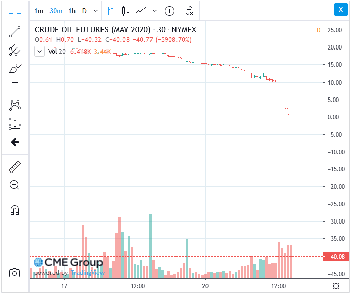 따라서 유가가 계속 떨어질것으로 예상되는 상황에 선물거래로 차익 남기려던 거래자들이 선물만기일 앞두고 이거 쥐고있다간 현물폭탄 안게 생겼으니 손해 감수하고 급매도 하는거고, 그러다보니 돈 얹어줄테니 가져가라고 하는 상황이 나오는듯. 한마디로 쓰레기봉투값 주겠다는거지