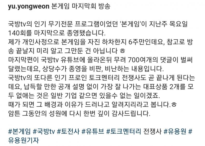 본게임을 담당했던 유용원기자의 이 2개 코너 폐지 이유를 모르겠다는 코멘트