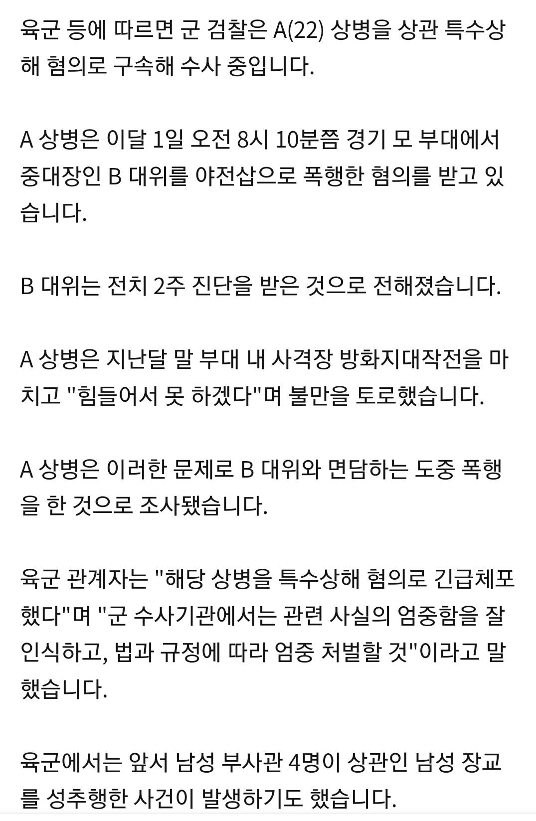 이 사건 좀 이상하던데 상병이 작업 다하고 투덜댔다고 중대장이 면담을하나? 거기에 상병은 야전삽까지 숨겨들구가서 때렸는데 전치 2주.. 아 그리고 대가리친건 아니고 팔이라고 함 하극상 좆되는건 상병짬이면 알텐데 직접 팬것도 이해가안되고 안밝힌 뒷얘기가 많을것으로 보임