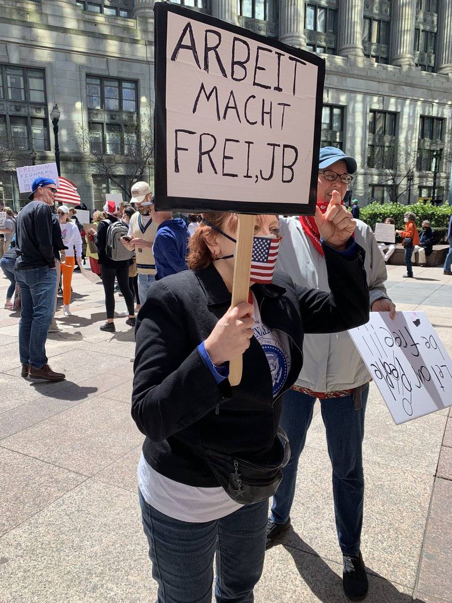 미국 봉쇄령 폐지를 주장하는 아줌마가 들고있는 종이쪼가리