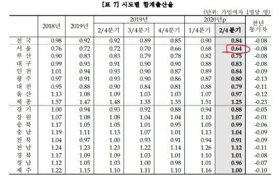 서울자체가 가임여성으로 대가리수 측정해서 계산하면 안됨. 서울거주하는 가임가능여성--->가임계획이있고 결혼&출산의 의지및능력을 가진 여성이 다른지역에 비해 월등히 떨어지니까. 정부부처잔뜩내려가있는 세종이랑 연구단지잔뜩있는 대전이랑 격차만 봐도 답나오지