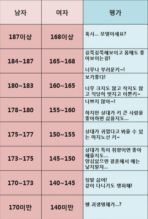 남자 20대 평균키 173.84, 여자 20대 평균키 161.46 으로 12.4센티 차이나는데 막 20~30센티씩 매칭시켜놓네 까놓고 여자키 140 밑이면 병이지 왜소증이나 뭐 그런. 그걸 남자 170 밑이랑 붙여놓네 미친년이