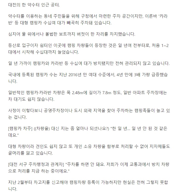우리단지도 민원많아서 딱 4대만 주차비 10만원받고 허용하기로 함 근데 우리단지는 그렇다치는데 단지근처 강변주차장가면 카라반 존나게 늘어서있음 진짜 다 견인해버려야하는데