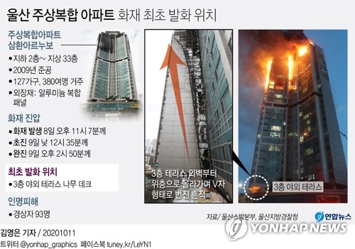 감식에 참여한 방경배 울산경찰청 과학수사계장은 "감식의 첫 번째 목적은 발화 원인을 규명하고 발화 부위를 특정하는 것"이라면서 "오늘 감식에서 발화 부위는 3층 야외 테라스에 있는 나무 데크로 확인했다"고 말했다.