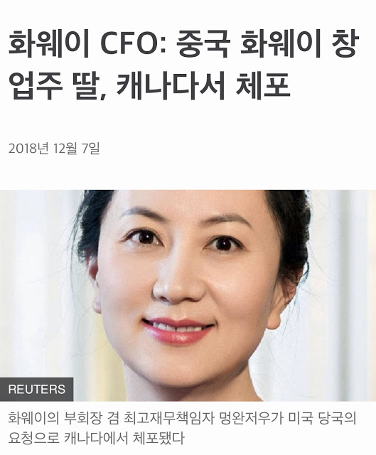 1. 2018년 12월1일, 화웨이 런정페이 회장의 큰딸인 멍완주어 부회장이 캐나다에서 체포되었고, 지금까지 풀려나지 못하고 있음