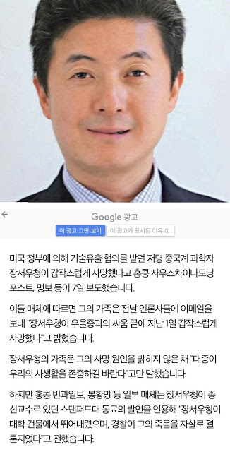 스텐포드 대학 중국인 교수 장서우청이 투신자살을 한채로 발견이 됨. 우울증에 의한 자살로 보도 됨.