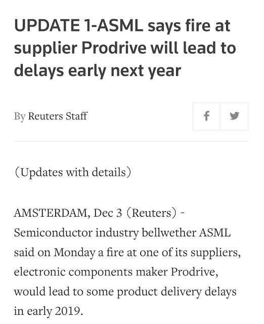6. 같은날인 2018년 12월1일, 네델란드 반도체 장비업체로 세계 1위기업인 ASML 협력업체에서 큰 화재가 나서 공장이 전소됨