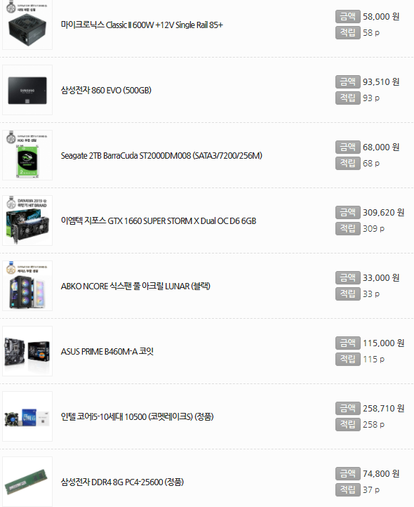 내가 쓸 것이 아니라 회사 선배 중학생 아들이 대학교 들어갈 때까지 쓸 PC 견적 내가 맞춰주는 상황에서 100만원 내로 끊으라 해서 해보니깐 저렇게 나오더라. 쿨러를 달면 100이 넘어감