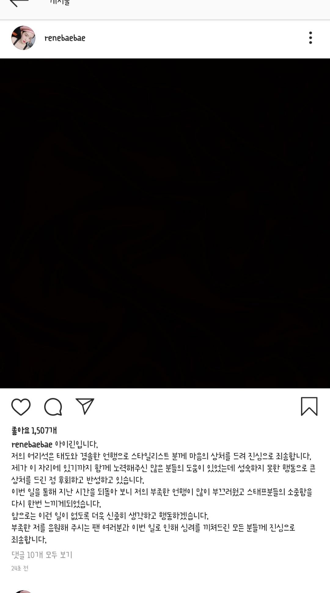 아이린은 오늘 오후 해당 스타일리스트와 직접 만나, 경솔한 태도와 감정적인 언행으로 깊은 상처를 드린 점에 대해 진심으로 사과하였으며, 성숙하지 못한 모습으로 많은 분께 심려를 끼쳐 죄송한 마음입니다.