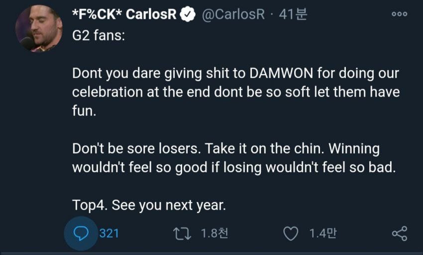 담원이 우리 세레모니 따라했다고 욕하는 븅신짓하지 말고 즐기게 놔둬라. 찌질한 패배자가 되지 말고 받아들여라. 지는게 이것만큼 아프지 않았다면 이기는게 그만큼 기쁘지 않았을거다. 4강, 내년에 보자