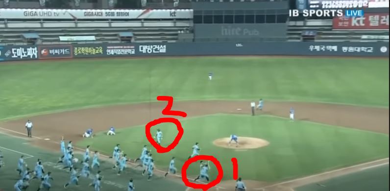 3루주자는 잘뛰고 있고 2루주자는 3루 안밟고 그냥 감.