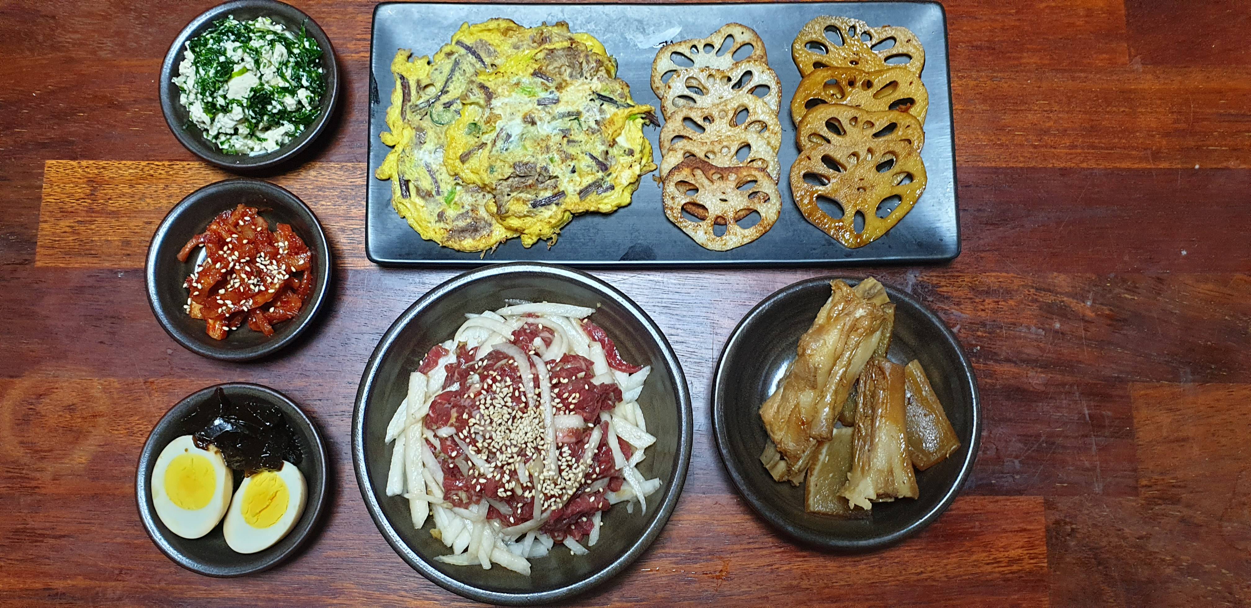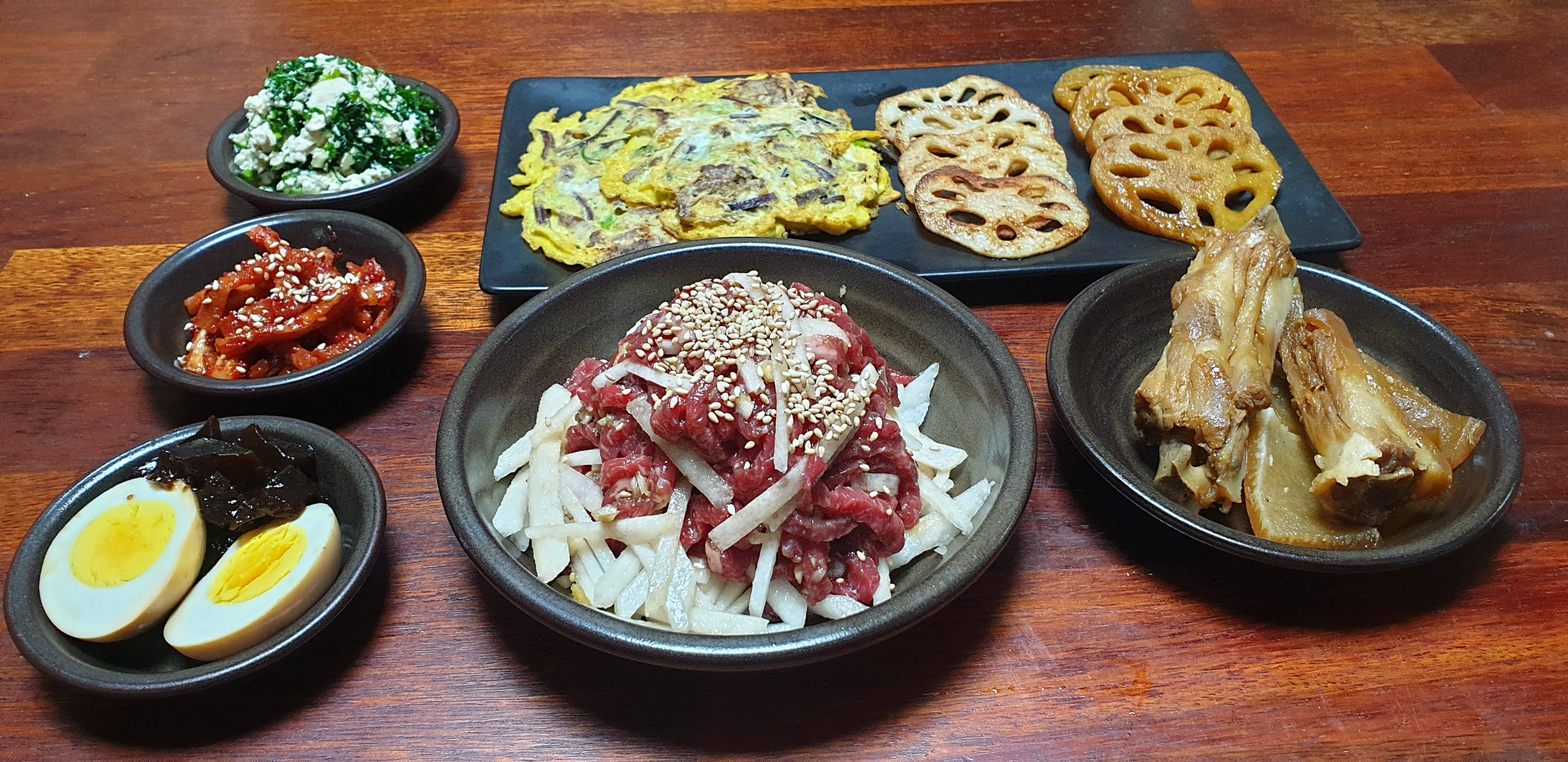 기내식은 파래두부무침 고사리와 파 앞부분을 넣은 육전 연근구이와 조림 짜조를 곁들인 계란장아찌와 돼지꼬리와 육회 그리고 데운 정종입니다