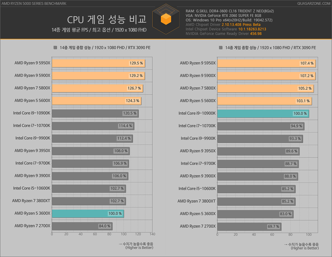 중급 보급형 라인인 5600x가 인텔상위 라인 i7을 쳐바르고 i9마저 누름
