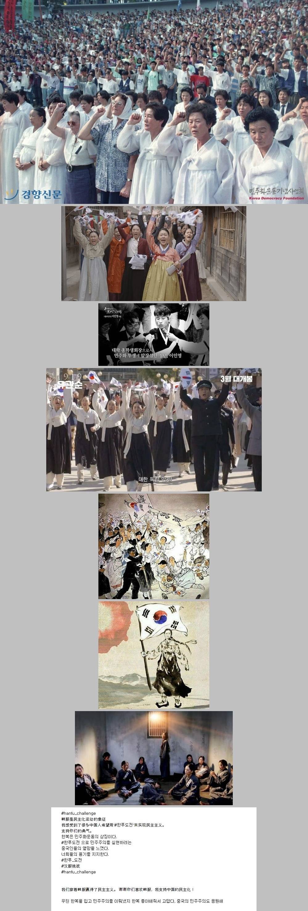 韩服是民主化运动的象征 我感受到了很多中国人希望用'#한푸도전'来实现民主主义。 支持你们的勇气。 한복은 민주화운동의 상징이다. #한푸도전 으로 민주주의를 실현하려는 중국인들의 열망을 느꼈다. 너희들의 용기를 지지한다. #hanfu_challenge #汉服挑战 #漢服チャレンジ #為了民主