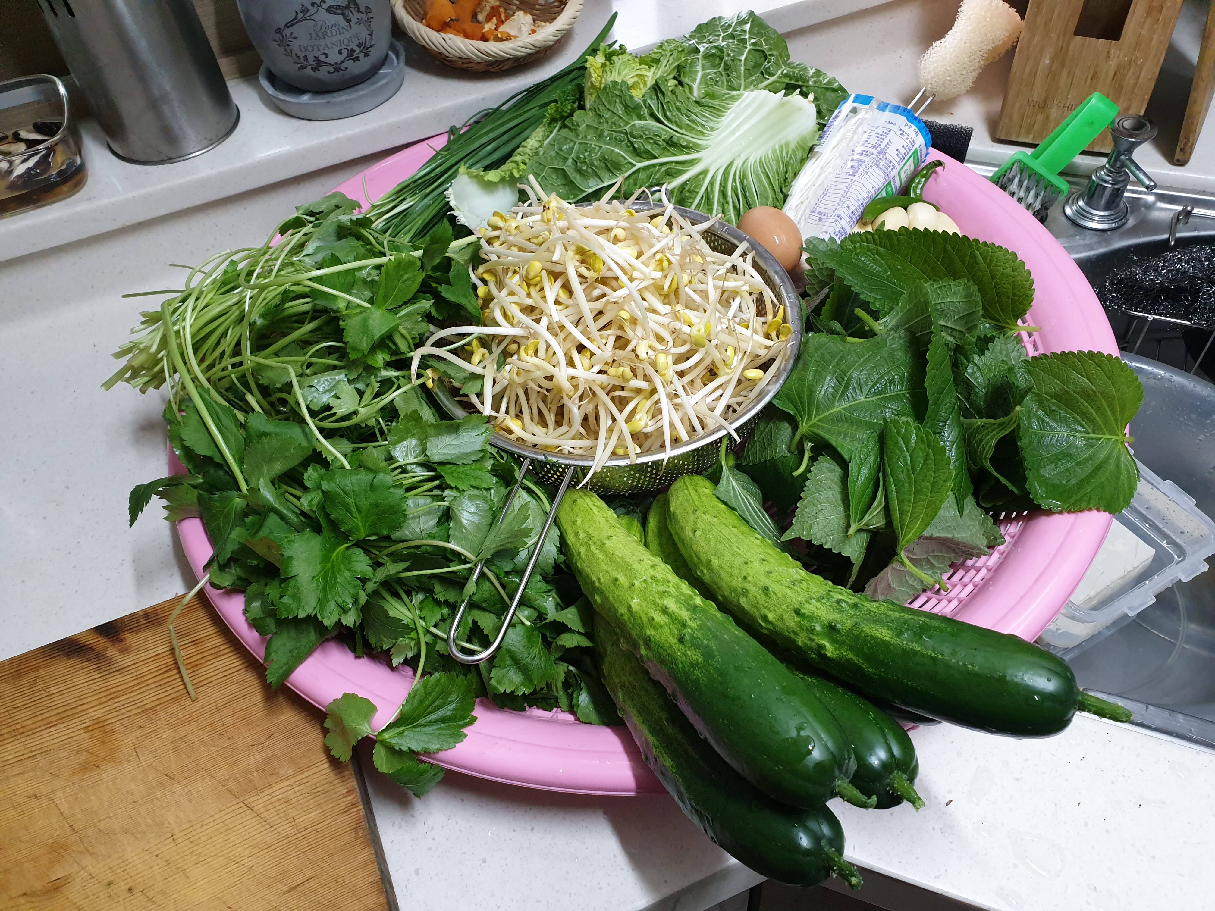 참나물 무치고 봄동 겉절이 오이랑 부추김치 팽이전 굽고 깻잎은 내장오면 조금 넣고 나머진 싸먹으려고