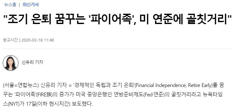 파이어족은 조기에 은퇴하기 위해 일반인보다 저축을 크게 늘리고 소비는 줄이는 생활을 한다. 이들이 명품, 신차, 새 전자제품을 사지 않아 미국 경제의 소비 감소를 초래하고 가뜩이나 낮은 물가상승률로 고민 중인 연준의 부담을 더 키운다는 것이다.