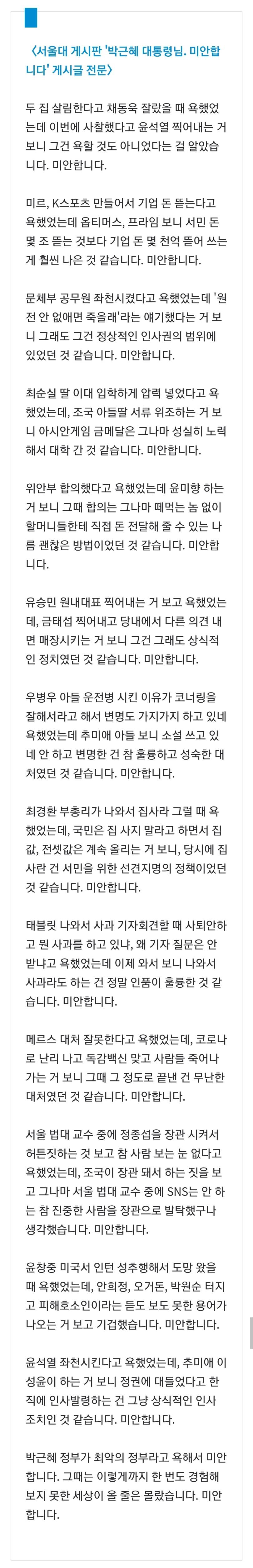 아직도 "야 그래도 박근혜는 아니지"라는 사람들 보라고 저 글이 쓰여진거 박근혜가 생각해보니 괜찮았다거나 박근혜 탄핵시켜서 미안하다는게(워딩은 비록 미안하다일지라도) 본질이 아니라 그 탄핵시킨 박근혜때보다도 이새끼들이 더 심한데 지금 뭐하고있냐는게 이 글의 핵심임