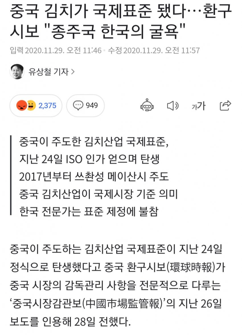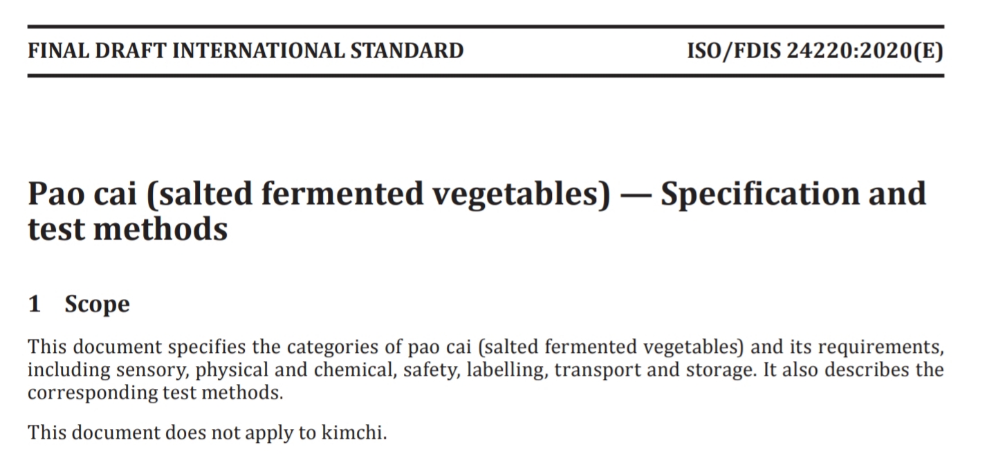 원래 박근혜정권때만해도 김치 수출가지고 분쟁이 있었음 중국에서 김치를 파오차이로 분류해놔서 중국에서 한국 김치 수입하는건 문제가 없지만 한국에서 중국으로 수출하는건 세균수 100g당 100마리 이내여야함. 발효식품이기 때문에 말도 아되는 조항이었고 국제표준규격인 CODEX에서 김치 세균수 기준을 변경하여 수출문제를 해결함. 애초에 파오차이는 중국 절임음식이지 김치랑은 다른거