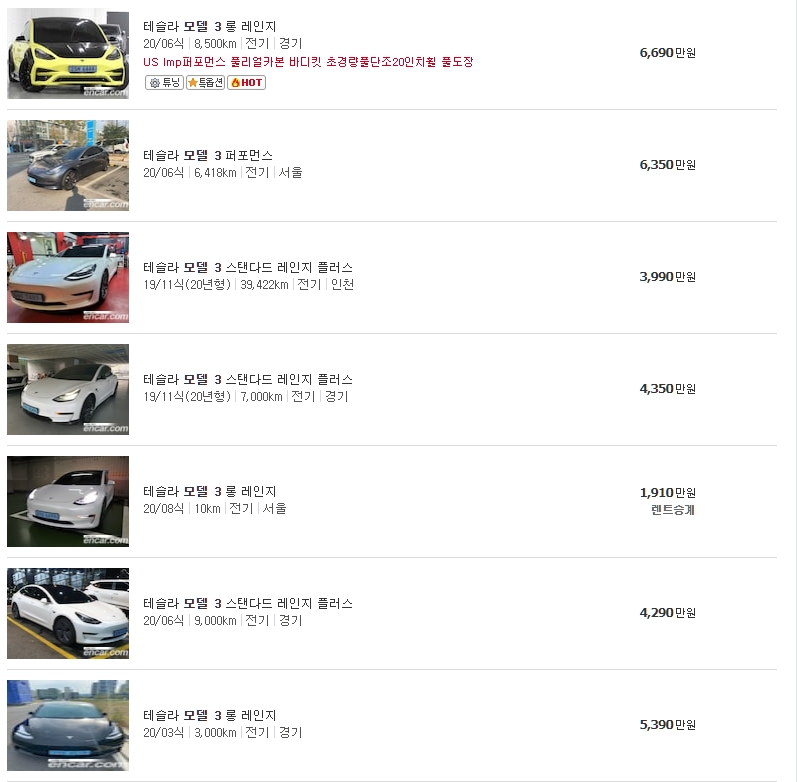 3번 모델3스탠 4만km 4179 - 3990 = 189만원