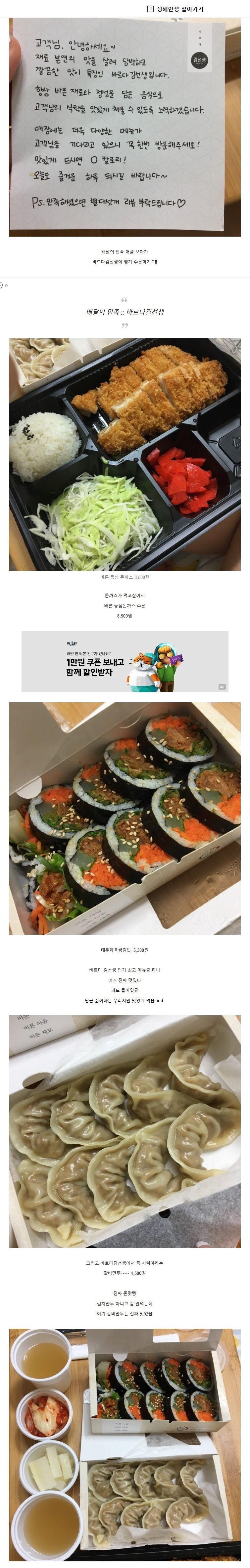 나도 위에 김밥 5200원에 파는 가게네 라고 쓴게 - 바르다 김선생이네 라는 의미였고 거기 배달 시키면 장국 주거든. 아마 저 리뷰쓴 사람은 단골일테지