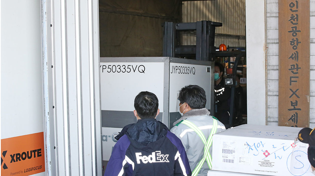 24일 인천공항으로 반입된 주한미군용 모더나 백신.