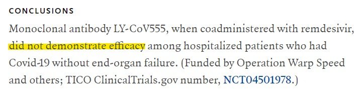 이 항체 치료제중 가장 먼저 등장해서 FDA 의 긴급 사용 승인까지 받은 릴리사의 LY-CoV555 가 결국 효과 없음으로 판정됨.