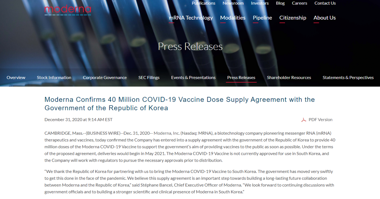 "우리는 COVID-19 백신을 대한민국과 파트너십을 통해 제공하게 된 것에 감사한다. 대한민국 정부는 이번 역병에 맞서 빠르게 움직였다. 우리는 이 공급이 장기적인 협력의 시작이라고 생각하고 있다."