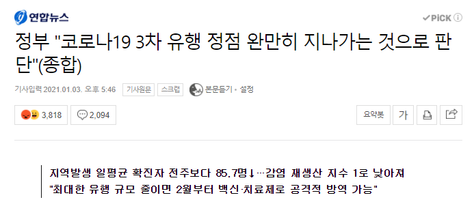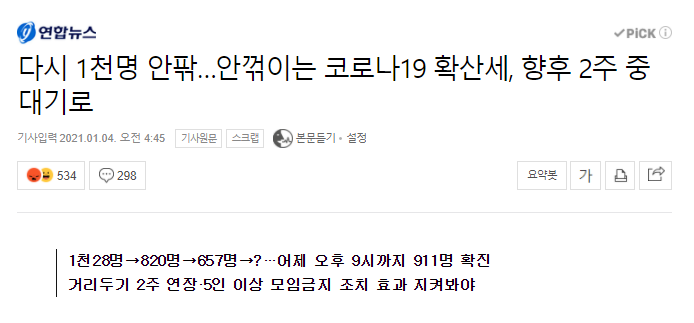 대체 "고점"이란게 어떻게 생길수 있다는 거야? 3단계라도 한것도 아니고 뭔 2.5단계효과 강화된2.5단계효과 말장난이나 하면서 효과나타날때가 됐다 됐다 몇주째 왱알대는데 시발 효과나온게 지금 이상태라고. 2.5단계에 포함된 헬스장 등등만 죽어나고 남들은 그대로 영업하는데다 확진자가 1000명이면 위험에 직접적으로 노출된 사람은 10만명이란 얘긴데 이게 느긋하게 정점지나길 기다릴 상황인거