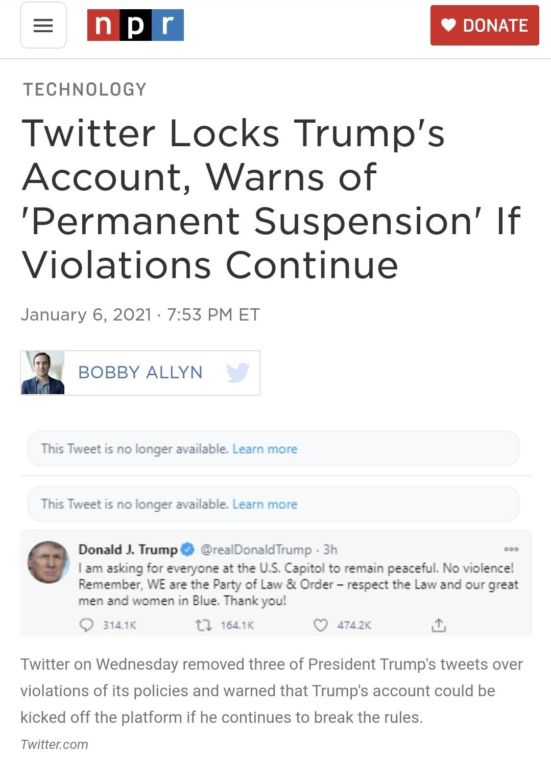 트위터는 "폭력 선동" 으로 12시간 밴 때려버림