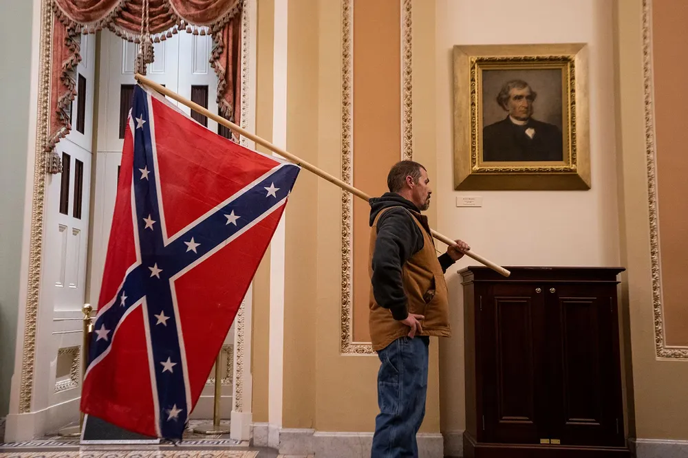 150년만에 전세를 역전시킨 남부연맹군 소속 병사가 미합중국의 수도 워싱턴DC에 소재한 의회를 점령한 모습이다.