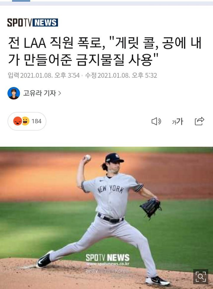 https://n.news.naver.com/sports/wbaseball/article/477/0000280104 전 LAA 직원 폭로, "게릿 콜, 공에 내가 만들어준 금지물질 사용" 8일(한국시간) 'LA 타임스'에 따르면 LA 에인절스는 지난해 3월 원정 선수들에게 투구에 로진과 송진을 배합한 금지 물질을 바르도록 도운 혐의로, 당시 원정 클럽하우스 매니저를 맡고 있던 브라이언 하킨스를 해고했다. 하킨스는 같은해 8월 에인절스와 MLB를 명예훼손으로 고소했다.