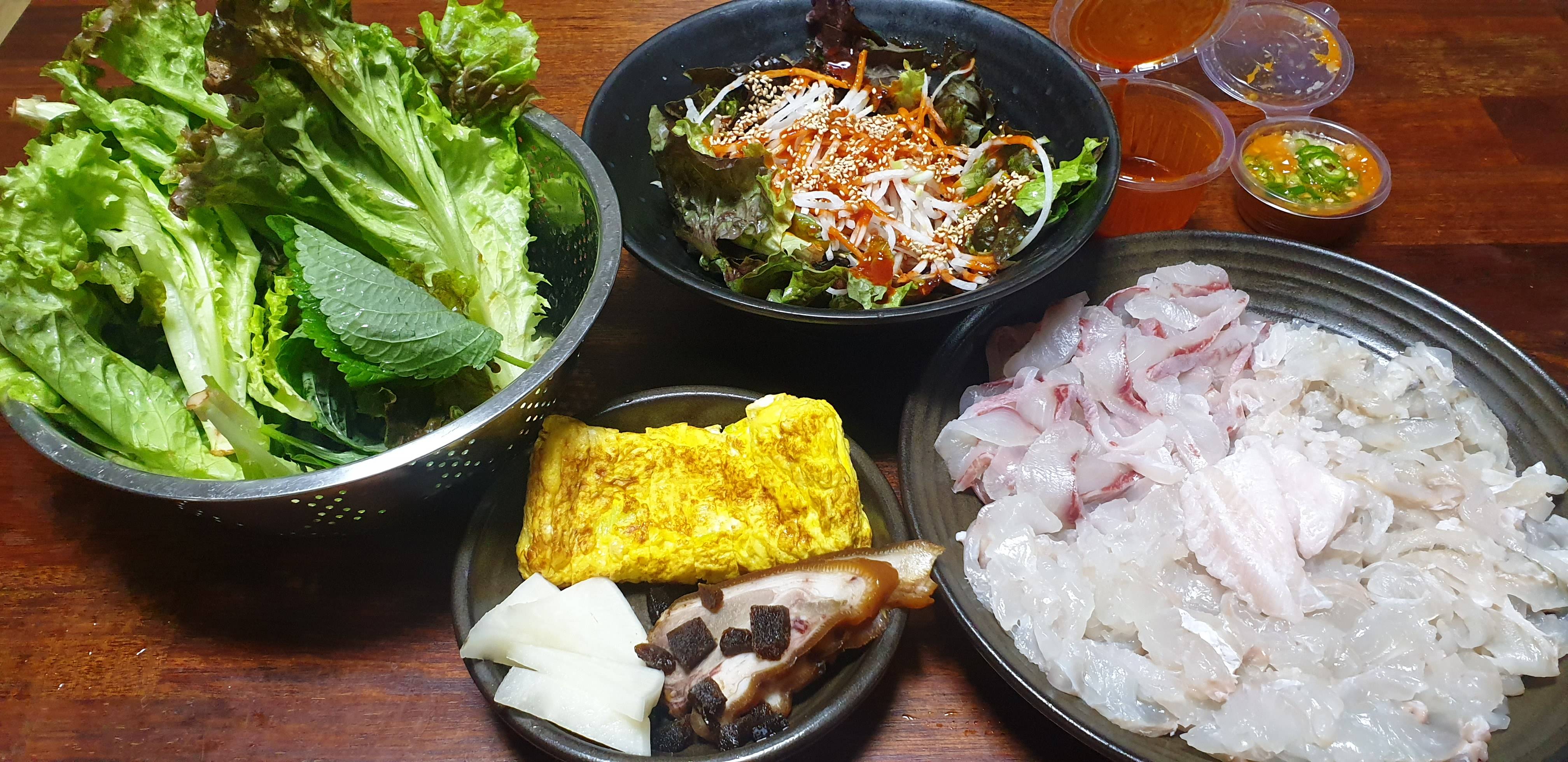 밀치 광어 우럭 소금으로 간을 한 미림과 파 앞부분을 넣은 계란말이 앞다히살 전지 족발과 짠슬