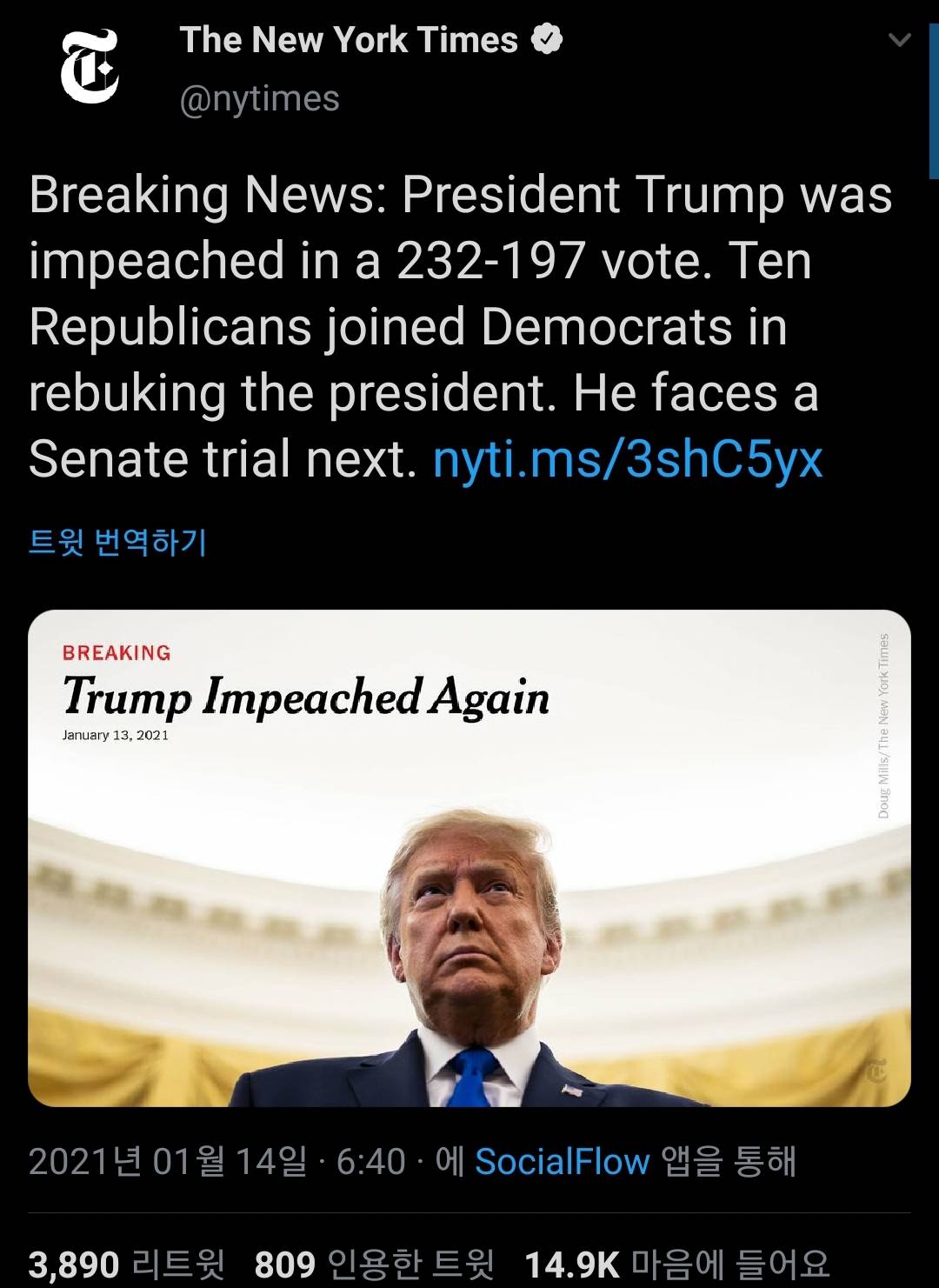 이로써 트럼프는 미국 역사상 두번 탄핵당한 대통령이 됨