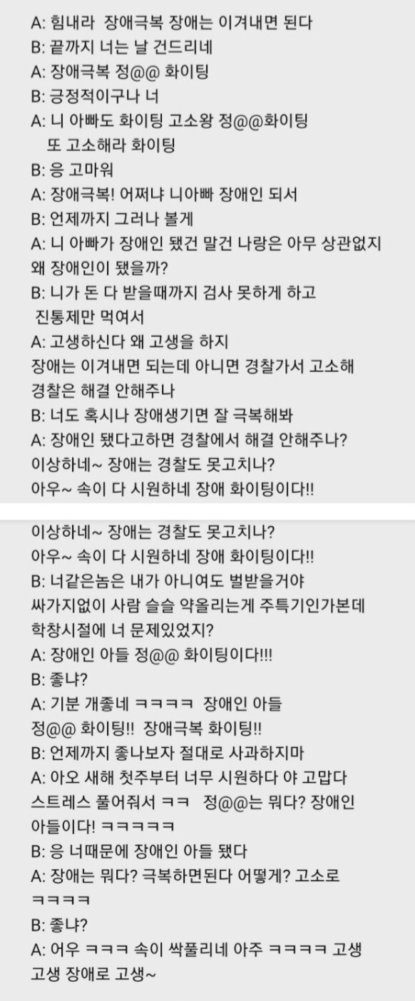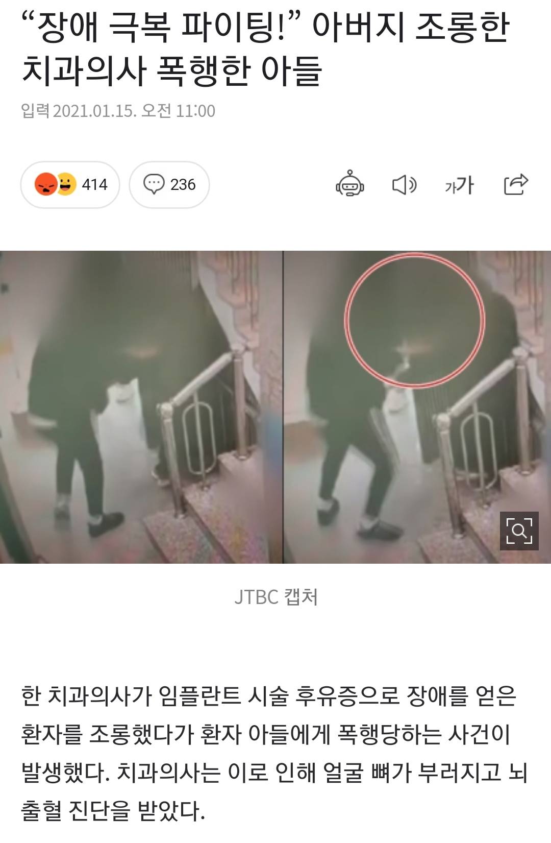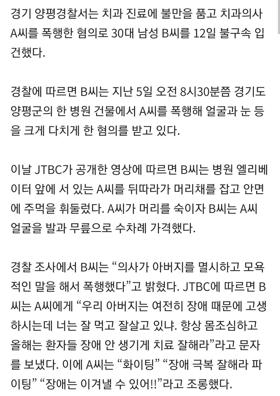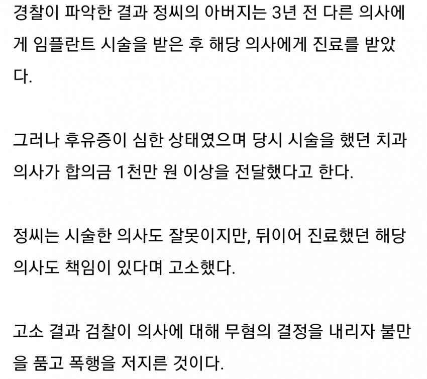 다른 의사한테 진료받고 장애가 생김 그 의사가 합의금 천만원 줌 의사A가 치과를 인수하고 계속 진료봄 장애환자 아들 B는 의사A한테도 책임이있다면서 3년간 의사A를 괴롭히고 고소함. 고소결과는 무혐의 아들B가 의사A보고 너만 잘먹고 잘사냐고 문자 보내자 의사A가 조롱답장보냄. 아들B가 의사A 찾아가서 폭행