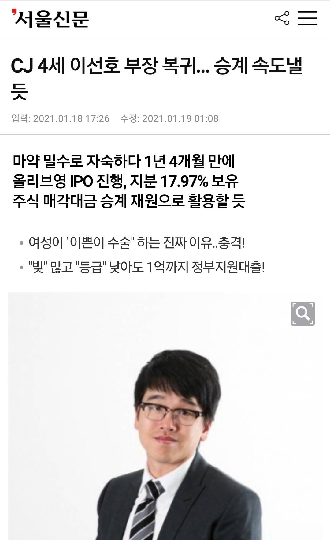 떡상한 CJ 주식 팔아서 그룹 물려받는데 쓸 예정
