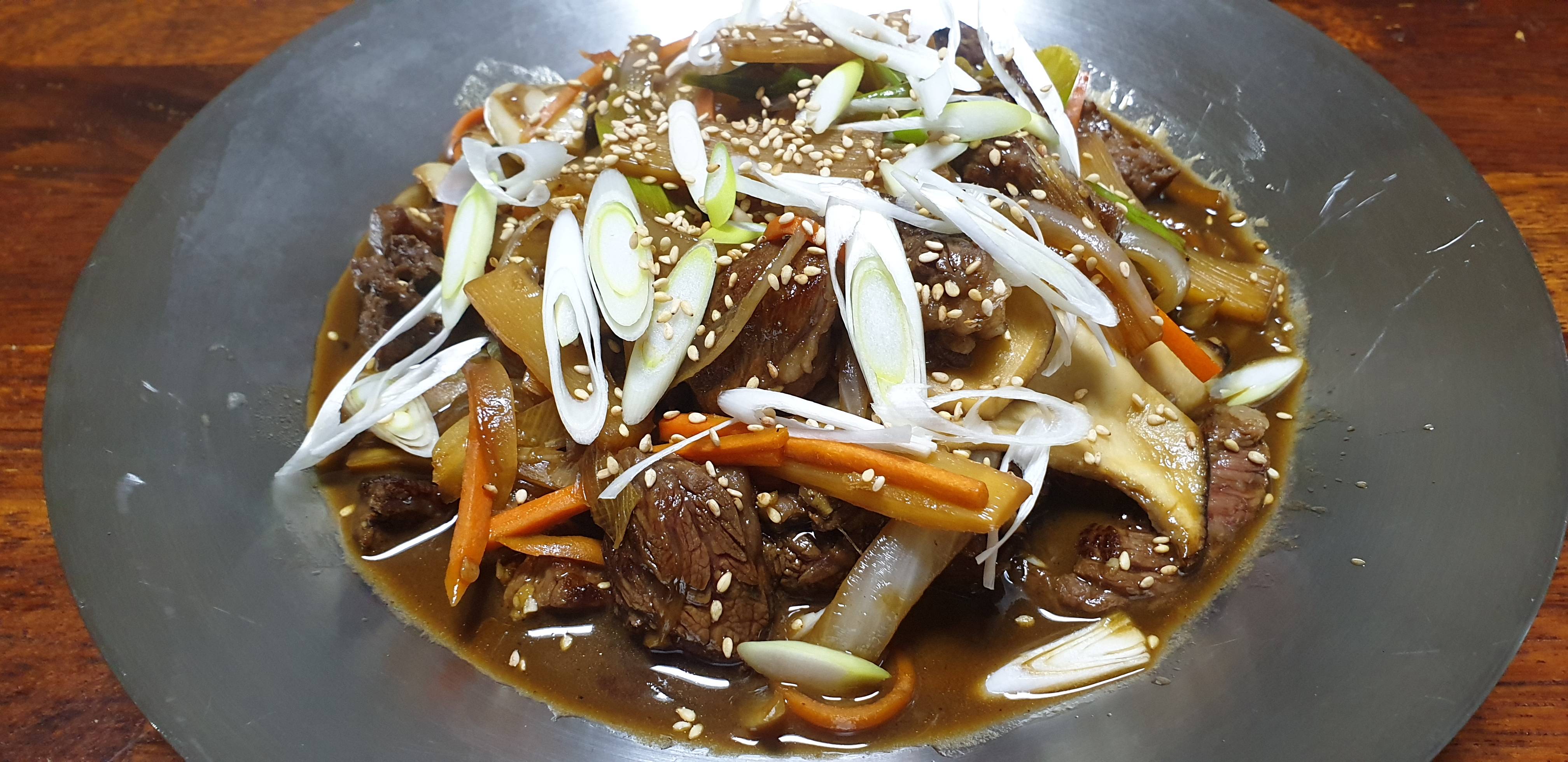 스테이크용 고기를 겉만 바삭하게 구은 뒤 불고기소스에 끍이는거지