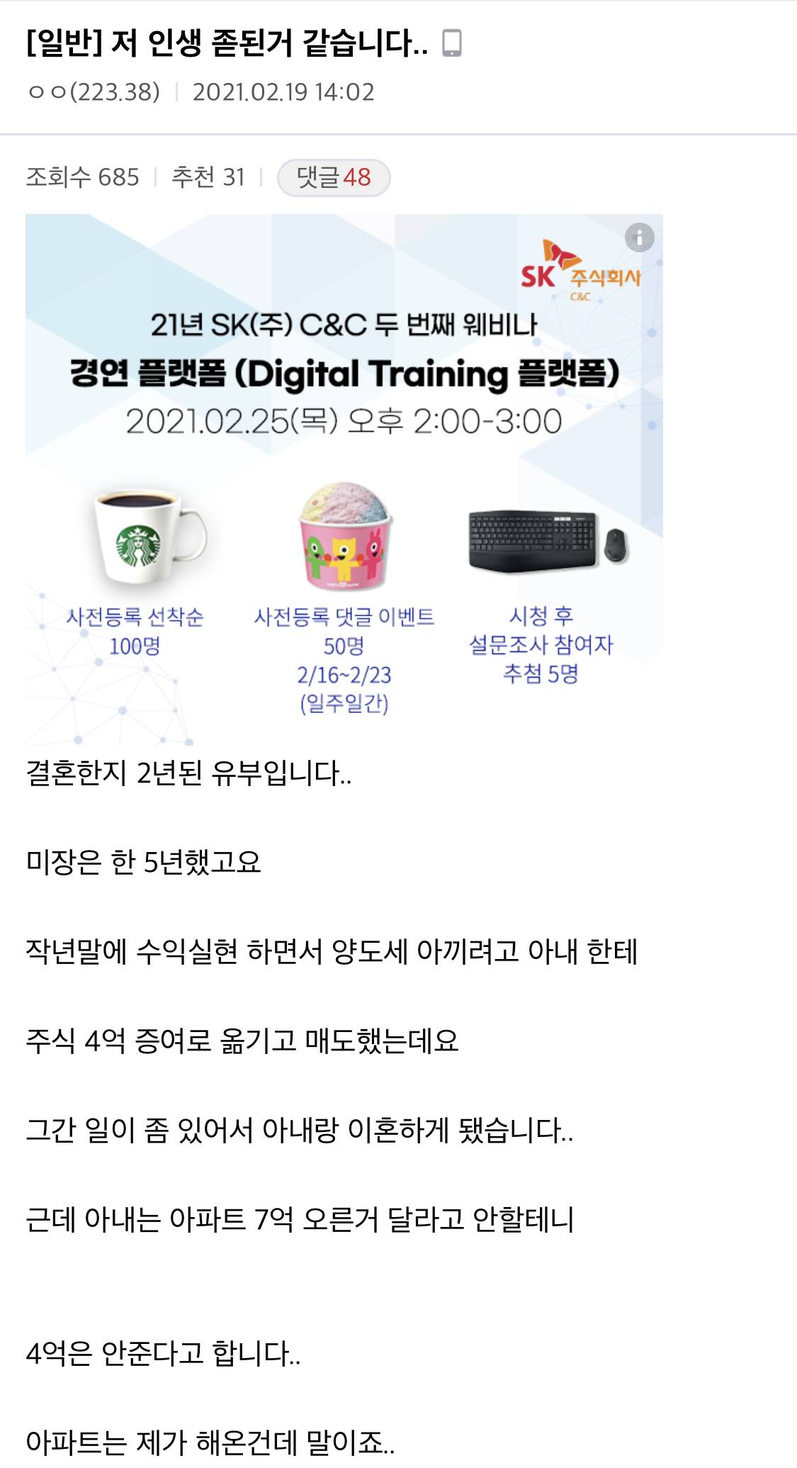 근데 이 경우는 결혼생활이 불과 2년밖에 되지않았고, 2년동안 4억이나 되는 자산을 모으는건 대부분의 사람에게 불가능하기에 남편이 빚을 낸거든 원래 갖고있는거든 남편힘으로 만든 자산일거고