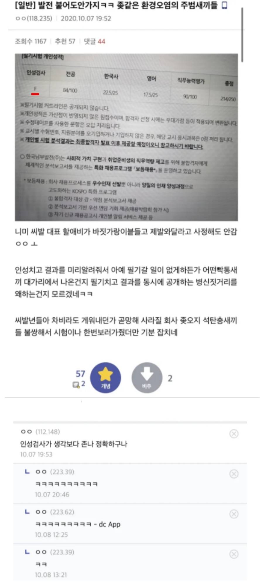 P/F 이겠지 F에서도 뭐 일관성이 없다던가 병신같은 문항체크하던가 그랬겠지 적당히 구라를 쳐야지 허허