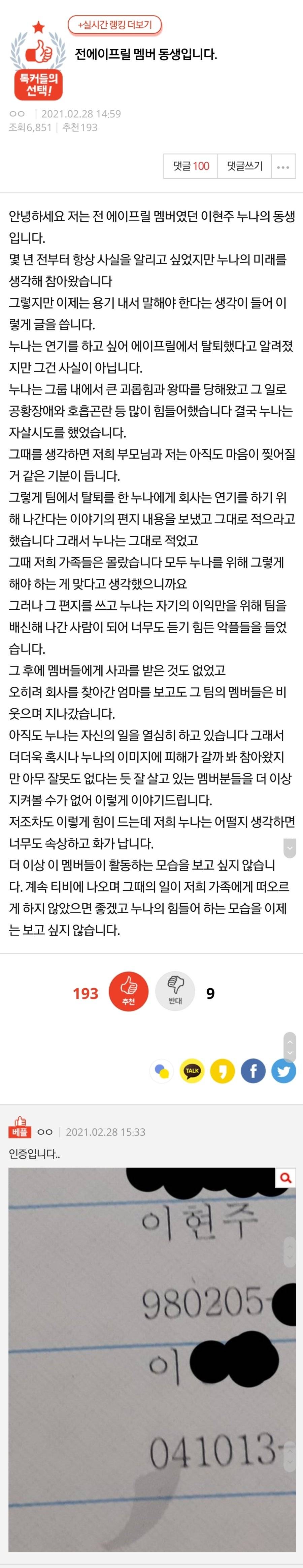 전 에이프릴 멤버였던 현주가 팀내 다른 멤버들의 견제 때문에 결국 팀 탈퇴하게 되었다는 폭로글이 올라옴.