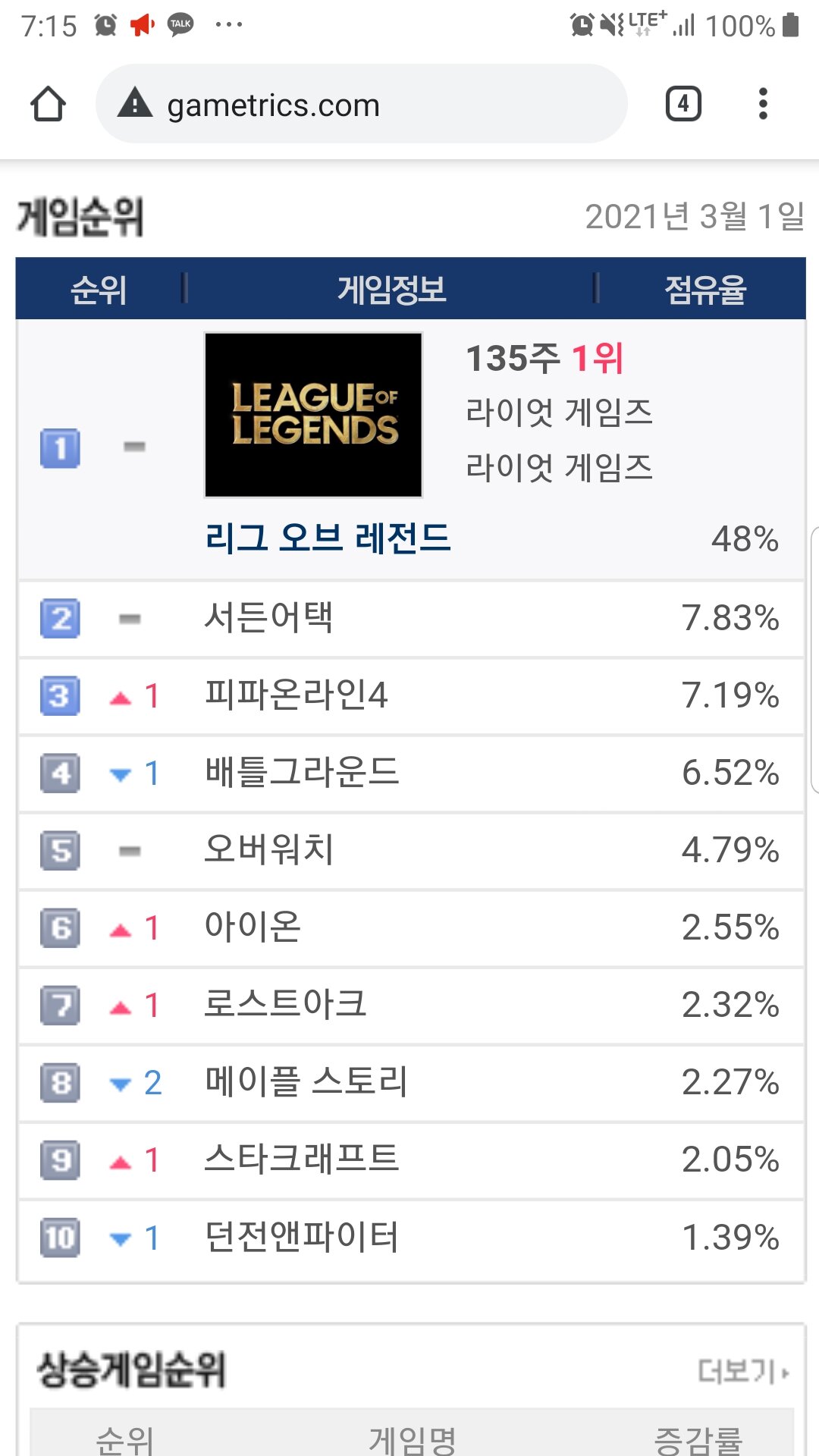 순위가 1순위 떨어지고 격차도 스타랑 2.05% 1.39% 나는걸로봐서 스타라 1.39%미만에서 2.05%로 급상승한게 아닌이상 던파도 떨어졌단 얘긴데