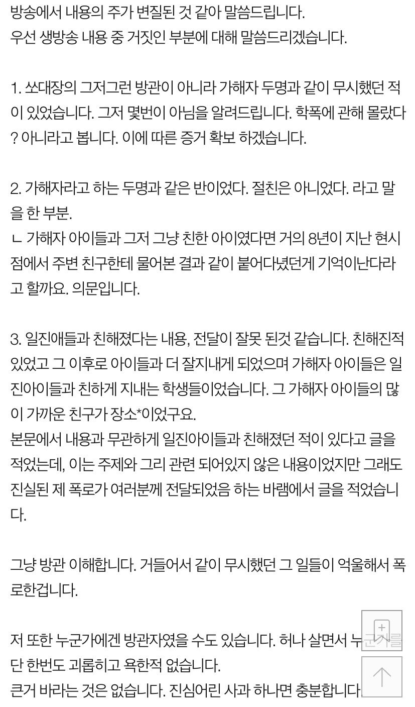 2. 폭로자가 말하는 가해자와는 친분은 있지만 친한 사이는 아니고 작성자가 왕따 당하는줄도 몰랐다.