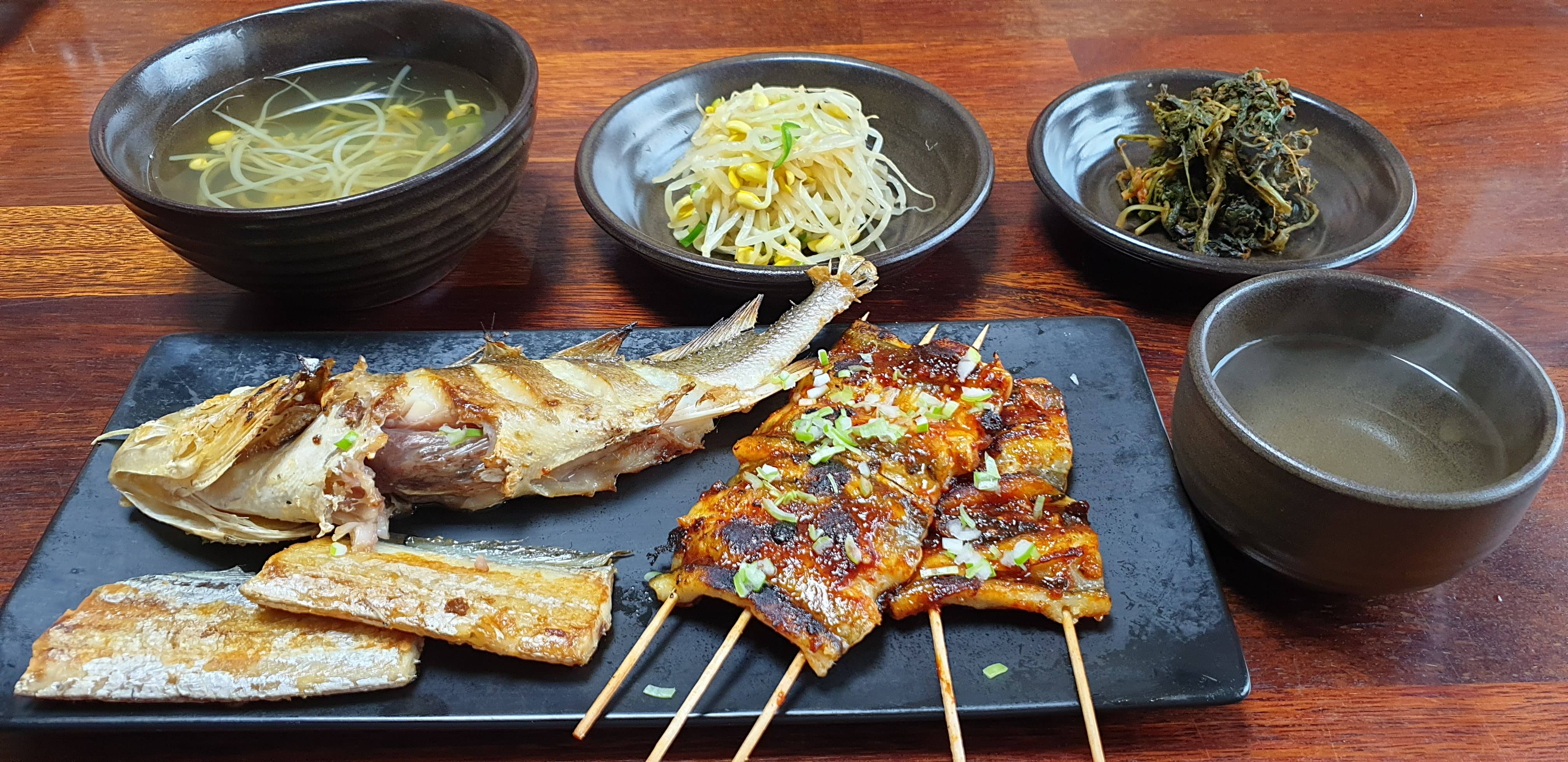 콩나물국 콩나물무침 응개무침 조기 칼치 바다장어에 따듯한 정종