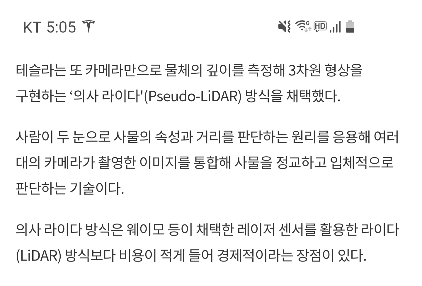 결국 테슬라는 "라이다 물론 있으면 좋지만 굳이 필요없다"는 건데