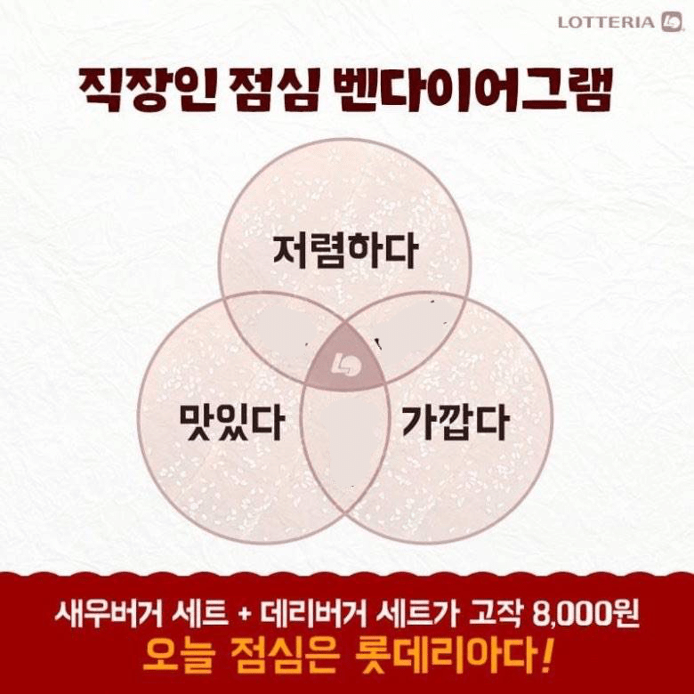 이거 나도 한참봤네. 롯데리아 까는 그림인줄 알았네 맛있고 저렴하고 가까운게 롯데리아라는 그림인데 밴더이어그램을 아는 나도 얼핏보면 맛없고 비써고 먼게 롯데리아라는 말로 읽힘