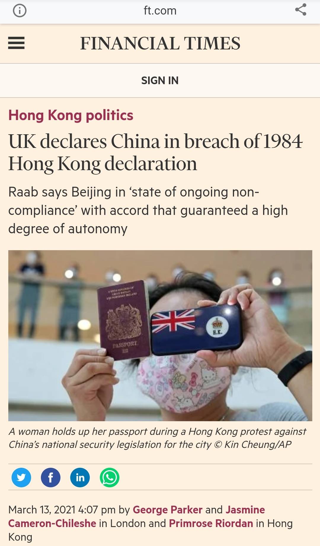 명분은 최근 홍콩의 멸망때문