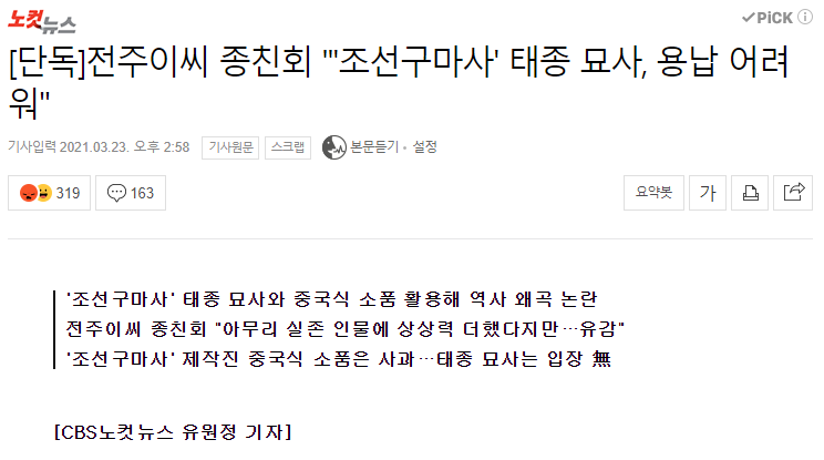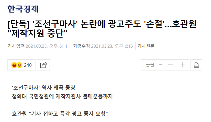 조선족 작가에 짱개냄새가 너무 가득해서 민원들어가고