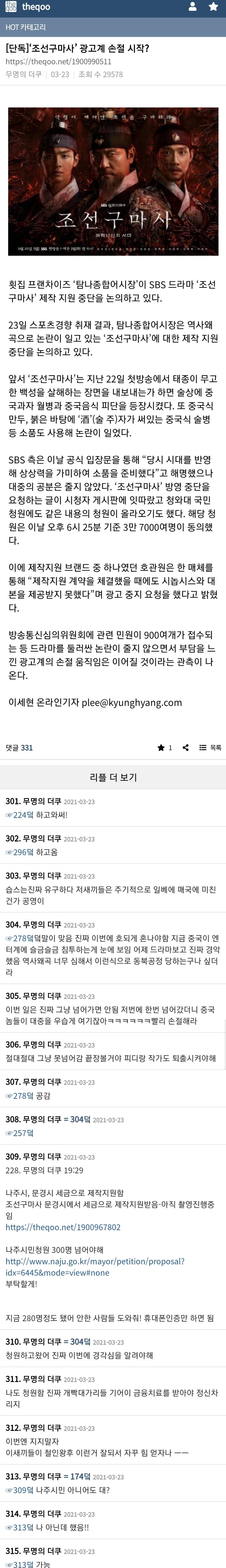 현재 이슈화되고 있는 SBS 월화 드라마 <조선구마사> 프로그램의
