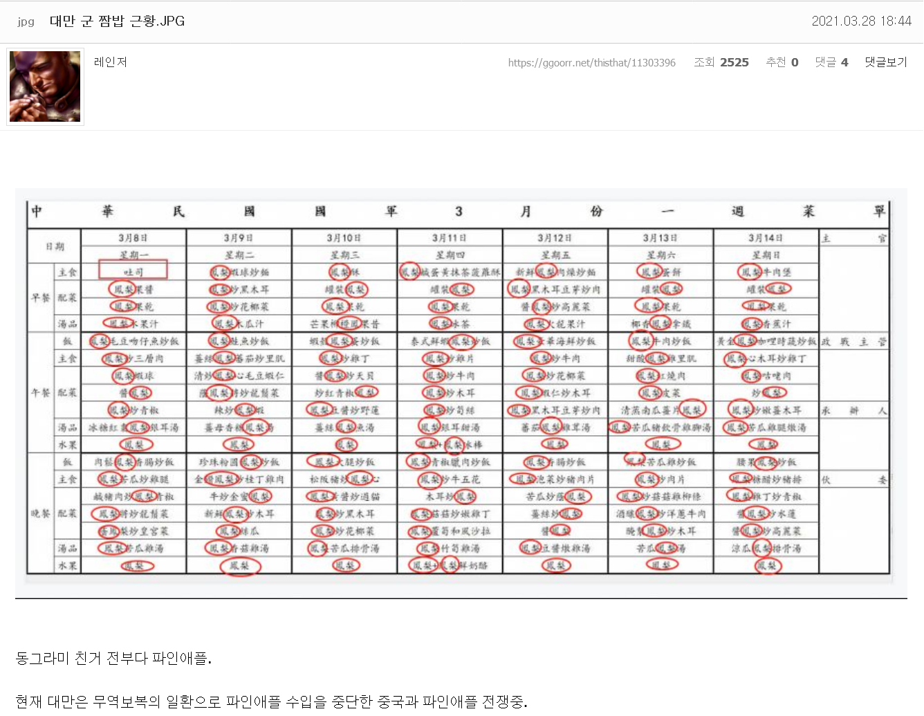 대만 쿤인 식단